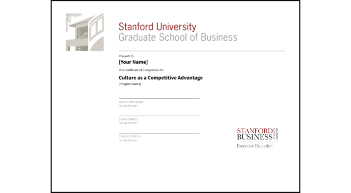 Upon successful completion of Culture as a Competitive Advantage, you will be awarded a Certificate of Completion in recognition of your achievement and the investment you have made in your education and professional development.