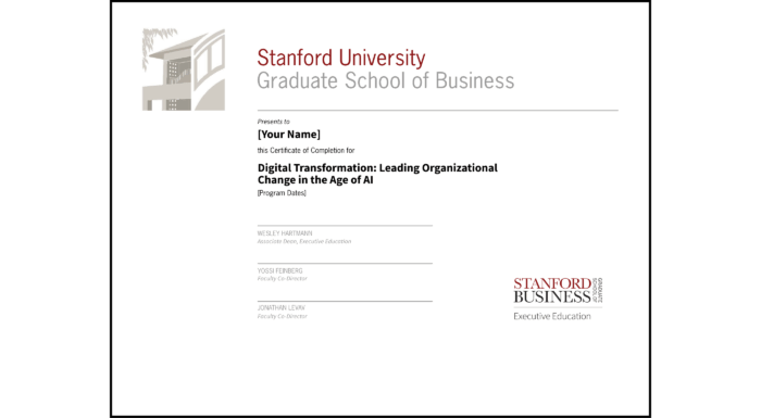 Upon successful completion of Digital Transformation: Leading Organizational Change in the Age of AI, you will be awarded a Certificate of Completion in recognition of your achievement and the investment you have made in your education and professional development.