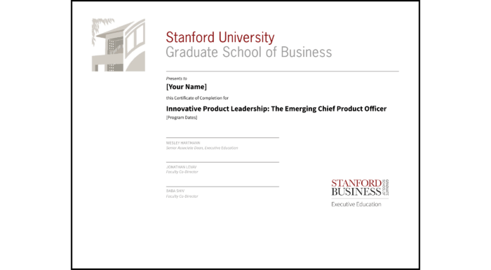 Upon successful completion of Innovative Product Leadership: The Emerging Chief Product Officer, you will be awarded a Certificate of Completion in recognition of your achievement and the investment you have made in your education and professional development.