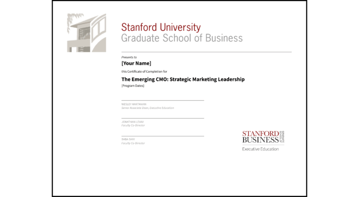 Upon successful completion of The Emerging CMO: Strategic Marketing Leadership, you will be awarded a Certificate of Completion in recognition of your achievement and the investment you have made in your education and professional development.